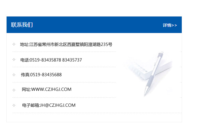 地址:常州市新北區友邦商務大廈1幢16、17層  電話:0519-85101652  傳真:0519-85112595  郵編:213022  網址:www.cz-jiayue_cn.yyx520.com  郵箱:xiajifengaa@163.com